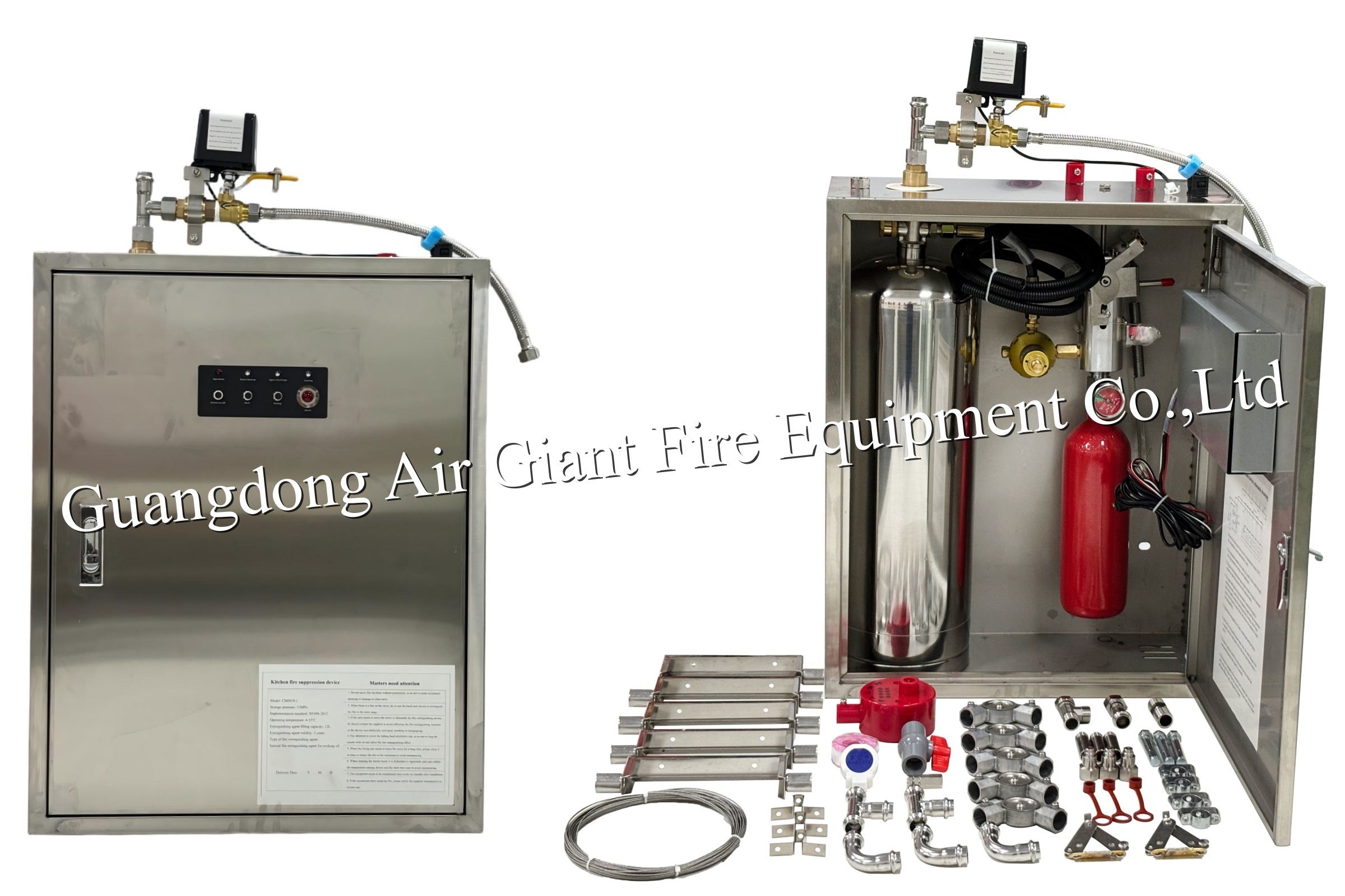 1.اسپری آگ خاموش کننده: هنگامی که مکانیسم انتشار فعال می شود، عوامل آتش خاموش کننده مایع (مانند فوم، پودر خشک،یا سایر عوامل تخصصی) از طریق نوزل ها بر روی سطوح تجهیزات اجاق آشپزخانه اسپری می شوند.، و همچنین داخل هود خروجی، فیلتر چربی و لوله های خروجی.این عوامل تخصصی می توانند شعله ها را در ظرف روغن به سرعت خاموش کنند و لایه ای را برای جلوگیری از احتراق بخارات نفتی ایجاد کنند، به این ترتیب جلوگیری از دوباره روشن شدن.